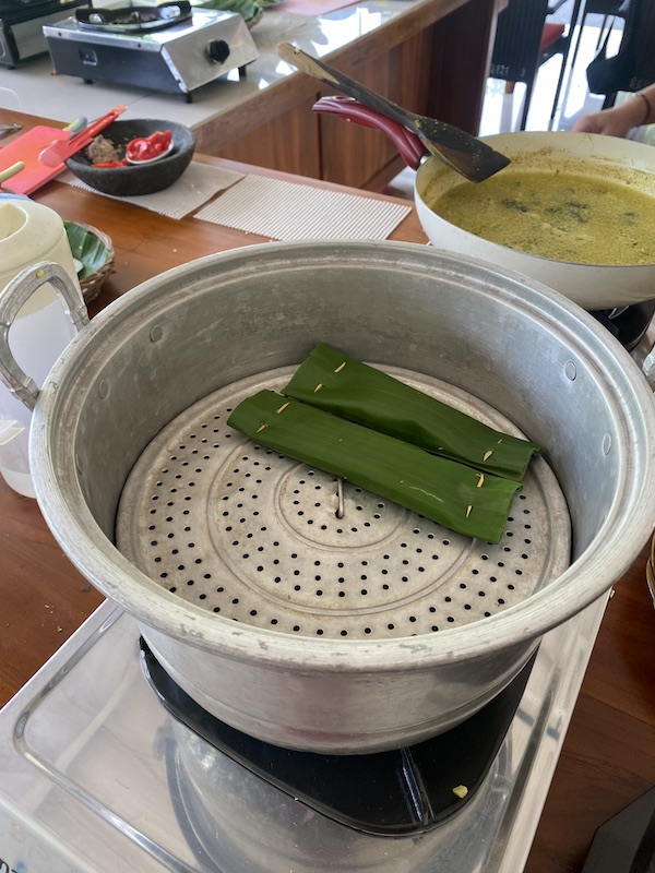 I was allocated fish wrapped in banana leaf, and Lou was allocated corn fritters. Others in the class got chicken satay, soto ayam (a clear soup with noodles and chicken), and tofu and tempeh curry. Everyone chipped in to make mie goreng (noodles) and tempeh sambal (a popular protein with a spicy tomato based sauce). Dessert was padar gulung (pancakes filled with a coconut mixture and infused with Pandan).